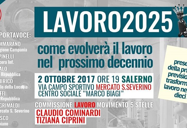 Obiettivo è tentare di prevedere e descrivere le caratteristiche del mondo del lavoro nel prossimo decennio cominciando dall’inarrestabile rivoluzione tecnologica in corso. Una fotografia necessaria a individuare interventi chirurgici per invertire la crisi. Lo strumento di programmazione per le future politiche del lavoro, ma anche educative, formative, industriali e di welfare verrà illustrato nella sala del Centro Sociale di Mercato San Severino (SA) in Via Campo Sportivo, lunedì 2 ottobre dalle 19:00 alle 21.00 e conterà sulla presenza di Tiziana Ciprini e Claudio Cominardi, deputati M5S in Commissione Lavoro.