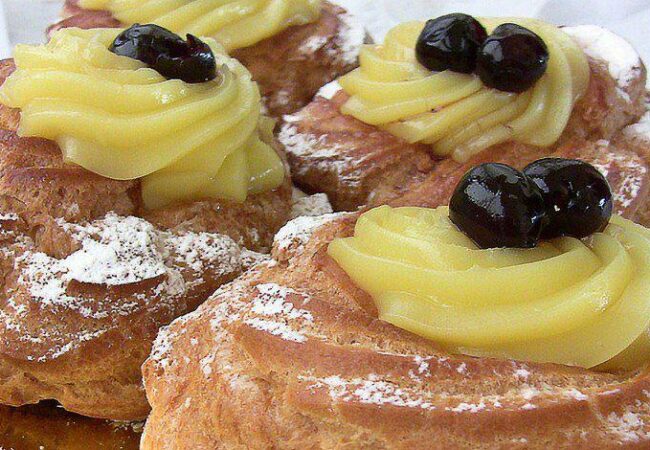 Un ciuffo di succulenta crema pasticciera sulla sommità di fragranti ciambelle fritte, una rossa amarena poggiata sulle decorazioni della gialla e profumata crema, un profumo che si espande nell’aria: ed ecco pronta sua maestà la zeppola di San Giuseppe.