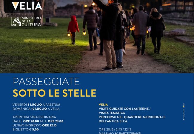 Si parte venerdì 8 luglio a Paestum e domenica 10 luglio a Velia con apertura delle due aree archeologiche dalle ore 20:00 alle ore 23:00 e biglietto di ingresso by night a € 5,00.