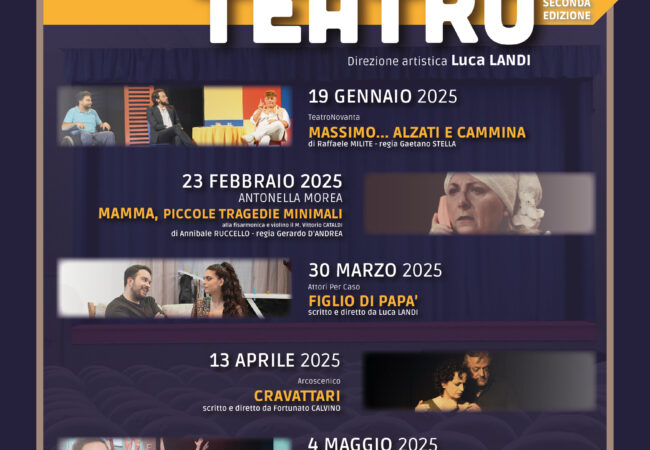 Non mancheranno gli spettacoli degli Attori per Caso, che oltre a organizzare la rassegna, porteranno in scena due rappresentazioni: il primo è “Figlio di papà”, al debutto il 30 marzo, una commedia inedita scritta e diretta da Luca Landi, un viaggio divertente e riflessivo nella psiche umana, tra vizi e virtù. Il 13 aprile va in scena “Cravattari” della compagnia Arcoscenico, scritto e diretto da Fortunato Calvino, che tratterà il tema dell’usura con grande intensità e verità. Chiude la rassegna il 4 maggio il secondo spettacolo degli Attori per Caso dal titolo “Io speriamo che me la cavo”, una commedia musicale scritta da Ciro Villano e diretta da Luca Landi, con la partecipazione di Antonio Fiorillo.