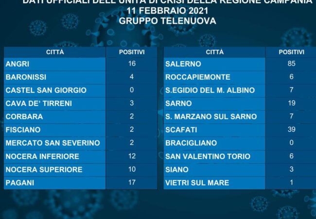 Come si può leggere nella tabella dei dati ufficiali, mentre solo a Castel S, Giorgio e Bracigliano non si sono registrati nella giornata di ieri nuovi casi, il picco maggiore nei comuni viciniori si è avuto ancora a Salerno con 85 nuovi casi, quindi Scafati con 39, Sarno con 19, Pagani con 17, Angri con 16, Nocera Inferiore con 12, Nocera Superiore con 10 casi.