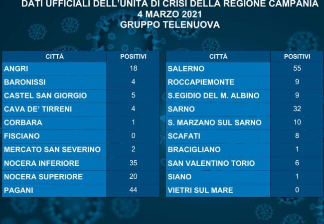 E’ quanto si rileva dal report ufficiale comunicato dall’Unità di crisi della Regione Campania, pubblicato in un post sulla propria pagina Facebook dalla emittente televisiva Telenuova di Pagani.