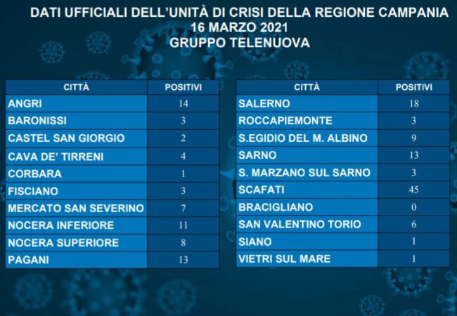 E’ quanto si rileva dal report ufficiale comunicato dall’Unità di crisi della Regione Campania, pubblicato in un post sulla propria pagina Facebook dalla emittente televisiva Telenuova di Pagani.