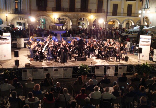 Il problema, però, è che il concerto è stato continuamente disturbato da musiche e frastuoni che si accavallavano, e che provenivano non tanto dai vari gruppetti di ragazzini, o anche adulti, che discorrevano tra loro, ma da gruppi organizzati di danzatori con “tammorre”, sbandieratori con codazzo di tamburi, mi sembra di aver sentito pure qualche gruppo di Trombonieri, che percorrevano il corso porticato verso Piazza San Francesco, strombazzando a più non posso, senza che nessuno li avesse avvertiti che dalle ore 21,00, inizio del concerto, non avrebbe dovuto fiatare neanche una mosca.