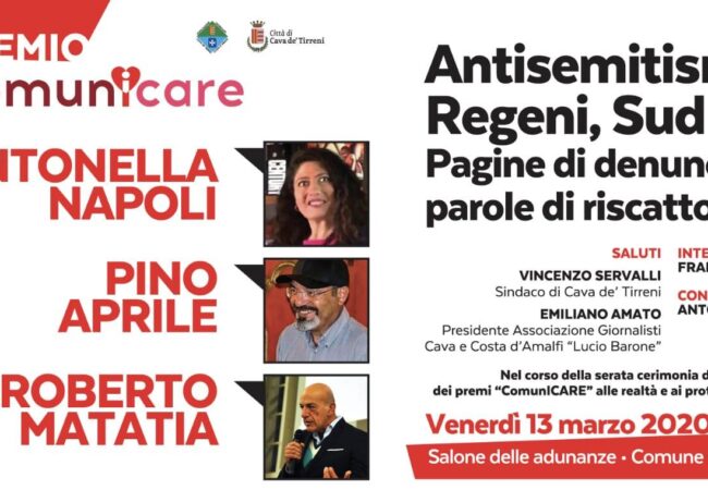 “Antisemitismo, Regeni, Sud: pagine di denuncia, parole di riscatto”: se ne discute venerdì 13 marzo, alle ore 18 a Palazzo di Città di Cava de’ Tirreni con i giornalisti dell’Associazione Amalfi-Cava de’ Tirreni “Lucio Barone” nell’ambito dell’annuale appuntamento di “ComunIcare”, il premio all’informazione, alla comunicazione e alla diffusione culturale svolte con “cura”.