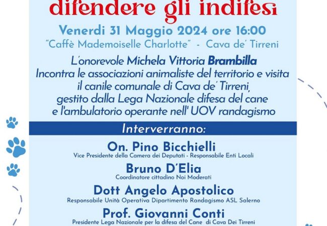 All’incontro interverranno il coordinatore cittadino di Noi Moderati della città metelliana Bruno D’Elia; il dottor Angelo Apostolico, responsabile dell’unità operativa dipartimento Randagismo dell’Asl di Salerno; il professor Giovanni Conti, presidente della Lega Nazionale per la difesa del Cane di Cava de’ Tirreni; la professoressa Dolores Carratu’, presidente dell’associazione “Vibrisse e Codine”; Danilo Sorrentino, vice presidente Anfor, associazione nazionale Forestale; Vincenzo Senatore, responsabile provinciale Aisa Guardie Zoofile; Gianna Senatore, presidente associazione Zoofila Nocerina. Le conclusioni sono affidate al vice presidente della Camera dei Deputati e Responsabile degli enti locali l’onorevole Pino Bicchielli e l’onorevole Michela Vittoria Brambilla.