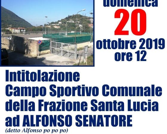 Domenica 20 ottobre, alle ore 10, presso il campo sportivo comunale di Santa Lucia si terrà la cerimonia la cerimonia di intitolazione del’impianto sportivo ad Alfonso Senatore, da tutti conosciuto come Alfonso po po po.