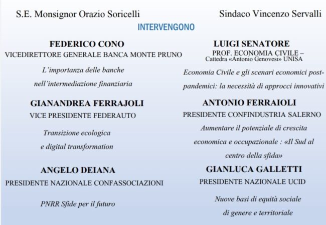 Oltre ai saluti istituzionali del sindaco Vincenzo Servalli ed alle riflessioni affidate a S. E. Monsignor Orazio Soricelli, al dibattito interverranno: Federico Cono, Vicedirettore Generale Banca Monte Pruno (L’importanza delle banche nell’intermediazione finanziaria); Luigi Senatore, Prof. Di Economia Civile- Cattedra “Antonio Genovesi”-Unisa (Economia Civile e gli scenari economici postpandemici: la necessità di approcci innovativi); Gianandrea Ferrajoli, Vicepresidente Federauto (Transizione ecologica e digital transformation); Antonio Ferraioli, Presidente Confindustria Salerno (Aumentare il potenziale di crescita economica e occupazionale : «Il Sud al centro della sfida»); Angelo Deiana, Presidente Nazionale Confassociazioni (PNRR Sfide per il futuro); Gianluca Galletti, Presidente Nazionale UCID (Nuove basi di equità sociale di genere e territoriale).