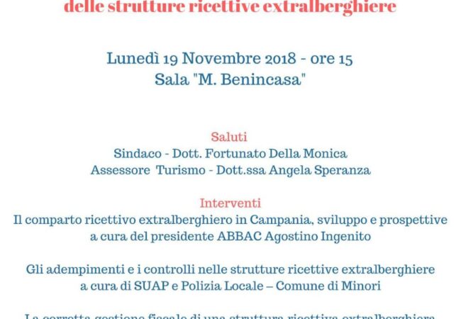 Si terrà oggi pomeriggio, lunedì 19 novembre, a Cetara, a partire dalle ore 15, presso la Sala polifunzionale “M. Benincasa”, un corso di aggiornamento gratuito per i gestori di bed and breakfast, affittacamere, case ed appartamenti per vacanze. promosso dall’Abbac, l’associazione regionale del comparto ricettivo extralberghiero in collaborazione con l’Amministrazione Comunale.