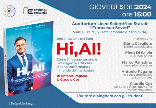 Due giorni dedicati all’intelligenza artificiale e a come IA sta cambiando il modo di fare marketing, organizzati dall’Associazione “Nessuno e Centomila”. Castellammare di Stabia e Cava de’ Tirreni, il 5 e 6 dicembre, accoglieranno la presentazione del libro “Hi, AI”, uscito già nella versione inglese, che ora arriva anche in Italia. Come l’ingegno umano e l’intelligenza artificiale stanno trasformando il mondo del marketing di Antonio Pagano e Claudio Gpt, co-autore virtuale, edito da 1886 Publishing.