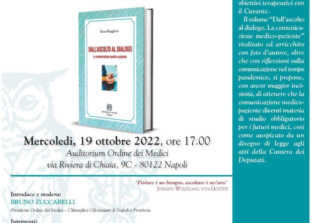 Mercoledì 19 ottobre alle ore 17, presso l’Auditorium Ordine dei Medici, via Riviera di Chiaia a Napoli, verrà presentato il libro di Rosa Ruggiero “Dall’ascolto al dialogo. La comunicazione medico-paziente”, direttore editoriale “Giuseppe De Nicola editore”.