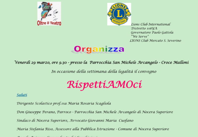“RispettiAMOci” è il titolo del convegno che si terrà domani venerdì 29 marzo, alle ore 9.30, presso la Parrocchia San Michele Arcangelo – Croce Malloni di Nocera Superiore, in occasione della Settimana della legalità. Un incontro per parlare di cittadinanza attiva, esperienze e buone pratiche per riconoscere e contrastare le mafie.