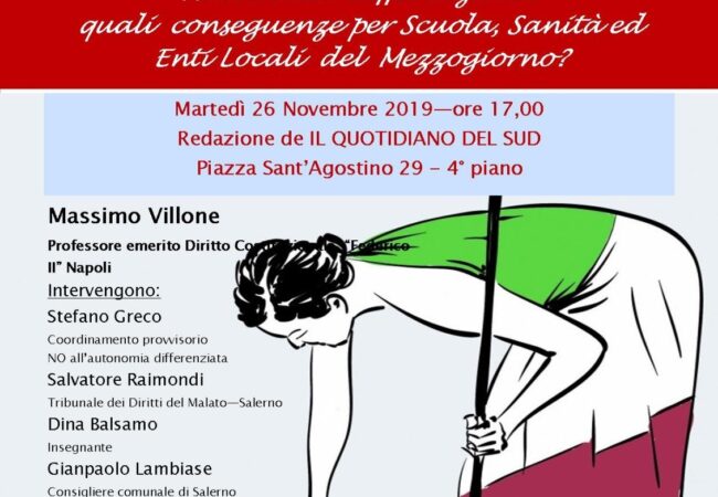 A seguito dell’appello già lanciato lo scorso 22 luglio dall’associazione Memoria in Movimento, si è costituito a Salerno un coordinamento provvisorio provinciale, aperto a tutti (singoli, gruppi, associazioni, partiti politici, forze sindacali confederali e di categoria, ecc.) contro le ipotesi di riconoscimento di un’Autonomia differenziata richiesta, ai sensi dell’art. 116 terzo comma della Costituzione, da diverse regioni, in particolare Veneto, Lombardia ed Emilia Romagna.