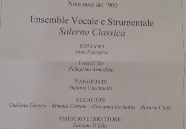 Il concerto sarà un ensemble vocale e strumentale e si esibiranno il soprano Anna Pietrafesa, al fagotto Pellegrino Armellino, al pianoforte Stefania Cucciniello e le vocalist Giuliana Tortora, Mimma Cerrato, Giovanna De Santis e Rosaria Cioffi. Dirige il Maestro e Direttore Luciano D’Elia.