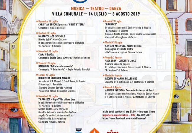 Si terrà tra cielo e mare nella splendida e panoramica cornice della Villa Comunale di Vietri sul Mare, la rassegna “Vietri in scena” con undici appuntamenti tra lirica, classica, jazz, pop, teatro e danza, grazie al protocollo d’intesa tra il Conservatorio di musica “G. Martucci” di Salerno,e il Comune di Vietri sul Mare.