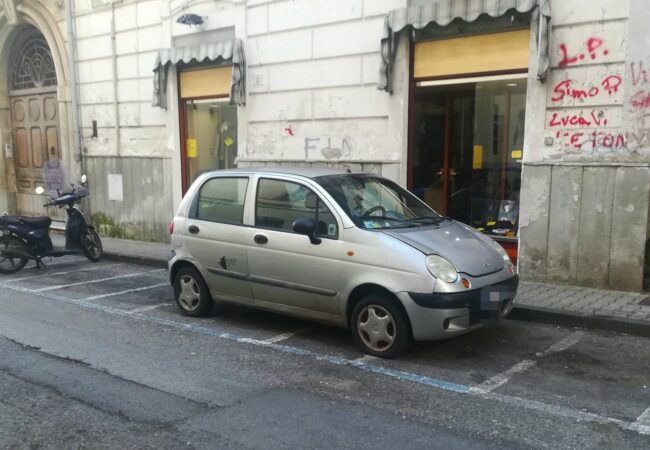 Siamo in via Rosario Senatore, zona centralissima, e come spesso accade, negli stalli per i motocicli è posteggiata un’auto. Sembrerebbe facile risolvere il busillis, l’automobilista non può posteggiare lì. Ma, andando a guardare meglio la segnaletica orizzontale, si può notare come vi sia un mélange di vernice bianca e di azzurra. Sembrerebbero stalli per veicoli a due ruote, ma quei tocchi d’azzurro potrebbero indurre anche a pensarla diversamente, come probabilmente sarà capitato al “distratto” automobilista.