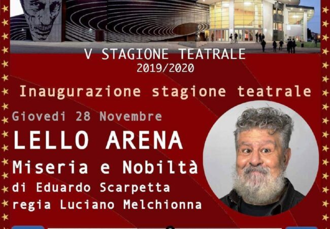 E’ in programma, infatti, lo spettacolo “Miseria e nobiltà” di Eduardo Scarpetta, interpretato dall’attore Lello Arena. L’appuntamento è alle ore 20.45.