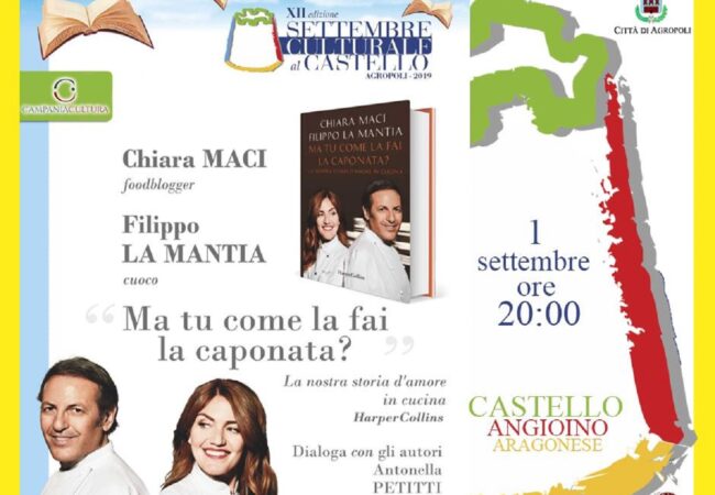 Secondo appuntamento della XII edizione del Settembre Culturale, domani 1 settembre. Alle ore 20, nel salotto letterario appositamente allestito nell’affascinante cornice del Castello Angioino Aragonese di Agropoli, a presentare il libro scritto a quattro mani “Ma tu come la fai la caponata?”, saranno la blogger, cuoca, conduttrice televisiva e scrittrice, originaria di Agropoli, Chiara Maci e lo chef di origini siciliane, suo compagno nella vita, Filippo La Mantia.