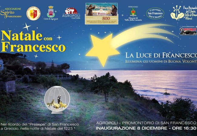 “La Luce di Francesco”, posizionata sul promontorio che domina lo “Scoglio con la Croce” di San Francesco, vuole rinnovare l’evento di Greccio e illuminerà le notti del Natale agropolese, dal luogo simbolo della presenza del Santo di Assisi nella nostra città.