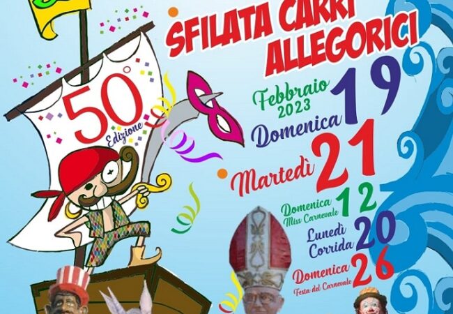 Le sfilate dei carri allegorici della 50esima edizione in programma il 19 e il 21 febbraio, la Corrida il 20 febbraio