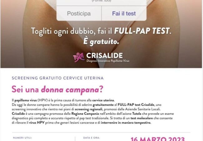 Lo screening Crisalide, promosso dall’ IZSM – Istituto Zooprofilattico del Mezzogiorno, è finalizzato all’identificazione della presenza dell’infezione da HPV – Papilloma Virus Umano anche in assenza di alterazioni cellulari. Il Full-pap Test ha l’obiettivo di comparare le tre principali metodiche analitiche per la ricerca del papilloma virus, tra HPV DNA, HPV mRNA ed esame citologico in fase liquida, per ottenere una diagnosi precoce ancora più affidabile.