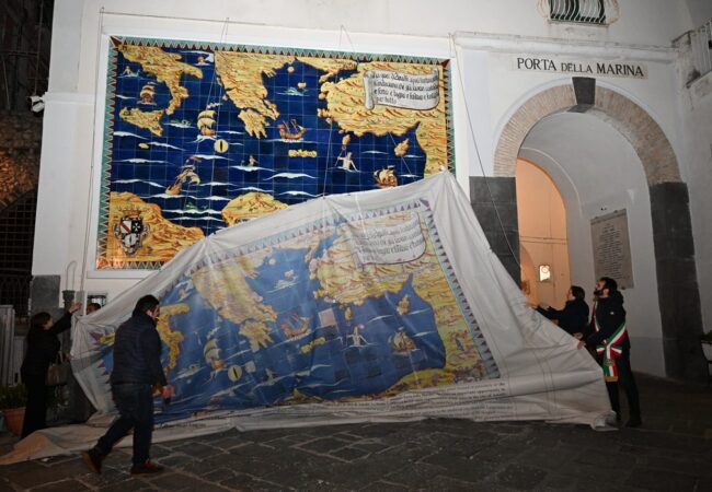 Amalfi, recupera il suo antico splendore il pannello maiolicato della Porta della Marina che raffigura il ruolo di crocevia tra Oriente e Occidente dell’Antica Repubblica Marinara