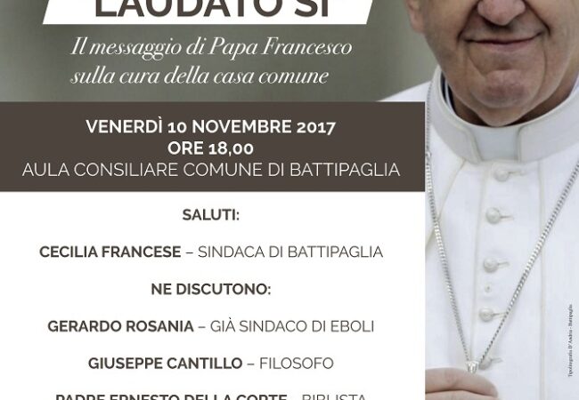 Si svolgerà venerdì 10 novembre 2017 alle ore 18 nell’aula consiliare del Comune di Battipaglia il convegno dal titolo “Laudato Si”, Il messaggio di Papa Francesco sulla cura della casa comune. Nel corso del convegno sarà anche presentato il libro di Papa Francesco “Terra, casa, lavoro”, I discorsi di Francesco ai movimenti popolari.