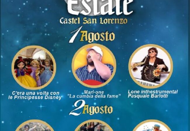 Si parte l’1 agosto alle ore 20:00 con lo spettacolo di majorette; alle ore 20:30 l’apertura della serata con l’artista Lone Inthestrumental Pasquale Barlotti; alle ore 21:00 La Notte delle Favole “C’era una volta” con le principesse Disney; a seguire, alle ore 23:00, l’artista Marione con “La cumbia della fame”; e per chiudere, alle ore 00:30, la chiusura della serata con Lone Inthestrumental Pasquale Barlotti.