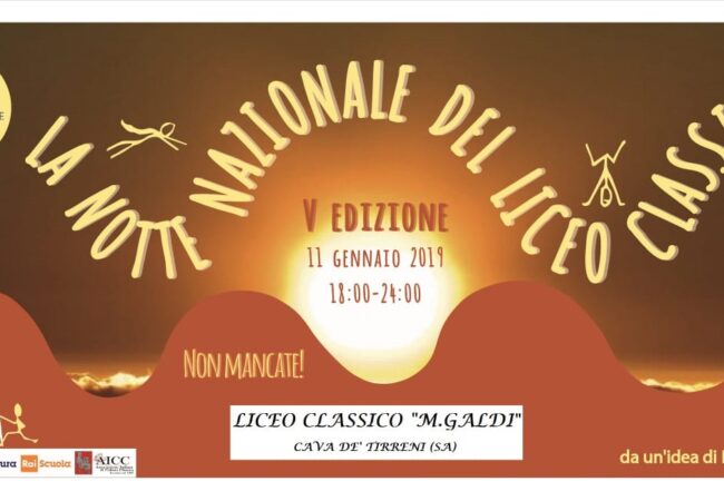 V edizione della Notte Nazionale del Liceo Classico cui ha come gli altri anni aderito anche il Liceo Classico “M. Galdi” di Cava de’Tirreni, insieme ad altri 432 licei italiani. L’evento, che si svolgerà in contemporanea, quest’anno si celebrerà venerdì 11 gennaio dalle 18,00 alle 24,00.