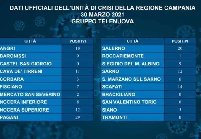 E’ quanto si rileva dal report ufficiale comunicato dall’Unità di crisi della Regione Campania, pubblicato in un post sulla propria pagina Facebook dalla emittente televisiva Telenuova di Pagani.