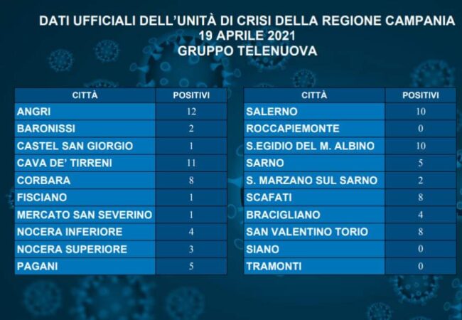 E’ quanto si rileva dal report ufficiale comunicato dall’Unità di crisi della Regione Campania, pubblicato in un post sulla propria pagina Facebook dalla emittente televisiva Telenuova di Pagani.