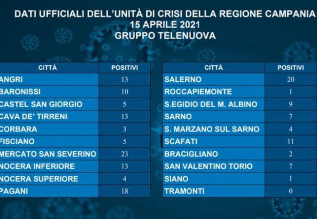 E’ quanto si rileva dal report ufficiale comunicato dall’Unità di crisi della Regione Campania, pubblicato in un post sulla propria pagina Facebook dalla emittente televisiva Telenuova di Pagani.