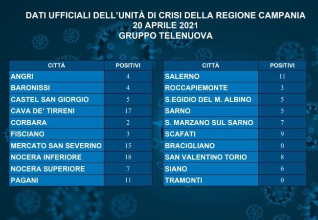 E’ quanto si rileva dal report ufficiale comunicato dall’Unità di crisi della Regione Campania, pubblicato in un post sulla propria pagina Facebook dalla emittente televisiva Telenuova di Pagani.