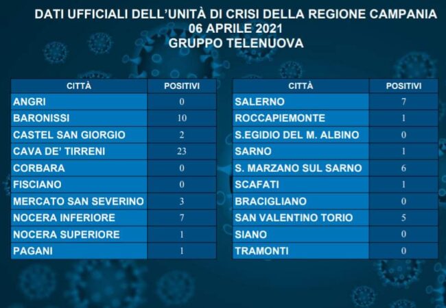 E’ quanto si rileva dal report ufficiale comunicato dall’Unità di crisi della Regione Campania, pubblicato in un post sulla propria pagina Facebook dalla emittente televisiva Telenuova di Pagani.