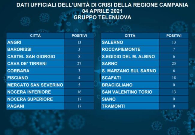 E’ quanto si rileva dal report ufficiale comunicato dall’Unità di crisi della Regione Campania, pubblicato in un post sulla propria pagina Facebook dalla emittente televisiva Telenuova di Pagani.