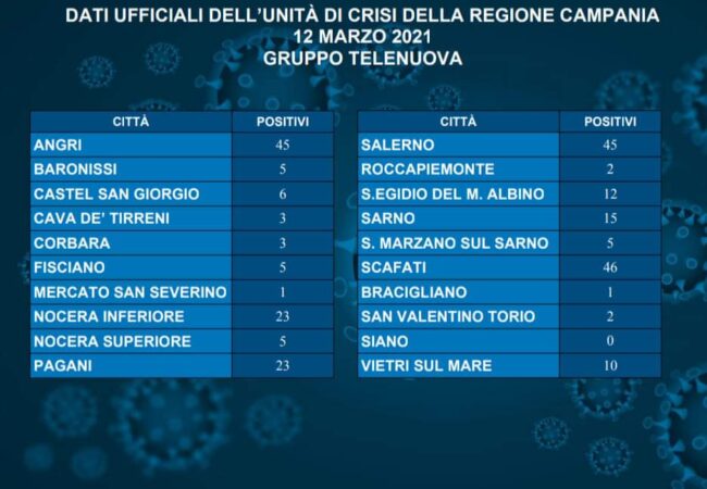 Come si può leggere nella tabella dei dati ufficiali, mentre solo a Siano non si sono registrati nella giornata di ieri nuovi casi, il picco maggiore nei comuni viciniori si è avuto a Scafati con 46 nuovi casi, seguito da Salerno e Angri con 45 nuovi casi, quindi Nocera Inferiore e Pagani con 23 nuovi casi.