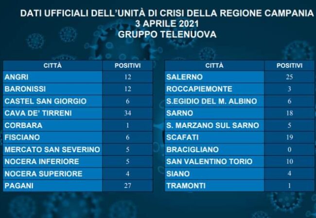 E’ quanto si rileva dal report ufficiale comunicato dall’Unità di crisi della Regione Campania, pubblicato in un post sulla propria pagina Facebook dalla emittente televisiva Telenuova di Pagani.