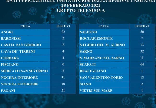 Come si può leggere nella tabella dei dati ufficiali, mentre solo a Fisciano non si sono registrati nella giornata di ieri nuovi casi, il picco maggiore nei comuni viciniori si è avuto a Scafati con 64 nuovi casi, seguita da Salerno con 50 nuovi casi, Sarno con 32 casi, quindi Nocera Inferiore con 31, Angri con 22 e Pagani con 21 nuovi casi.