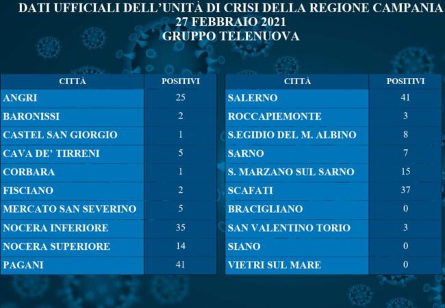 Come si può leggere nella tabella dei dati ufficiali, mentre solo a Bracigliano, Siano e Vietri sul Mare non si sono registrati nella giornata di ieri nuovi casi, il picco maggiore nei comuni viciniori si è avuto a Salerno e Pagani con 41 nuovi casi, seguita da Scafati con 37 nuovi casi, quindi Nocera Inferiore con 35, Angri con 25.