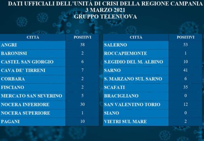 Come si può leggere nella tabella dei dati ufficiali, mentre solo a Bracigliano e Siano non si sono registrati nella giornata di ieri nuovi casi, il picco maggiore nei comuni viciniori si è avuto a Salerno con 53 nuovi casi, seguita da Sarno con 41 nuovi casi, Angri con 38 nuovi casi, Nocera Inferiore con 30 nuovi casi.