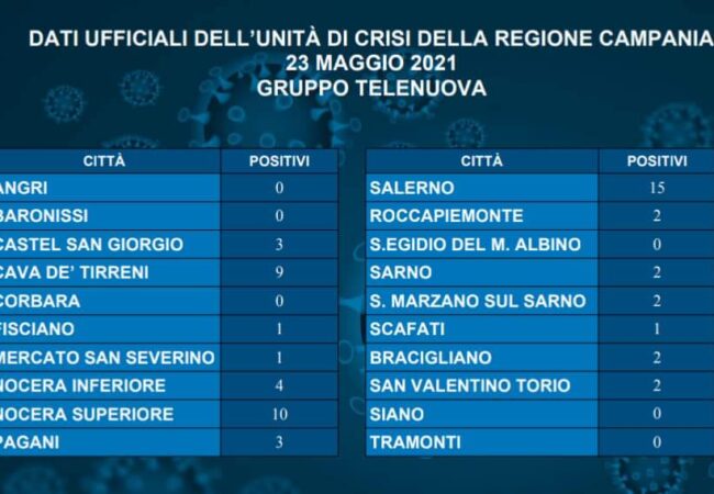 E’ quanto si rileva dal report ufficiale comunicato dall’Unità di crisi della Regione Campania, pubblicato in un post sulla propria pagina Facebook dalla emittente televisiva Telenuova di Pagani.