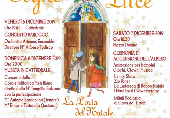 Domani, sabato 7 dicembre, con inizio alle ore 18.30, la grande festa con la tradizionale accensione del Grande Albero, in piazza Vittorio Emanuele III, al centro della città, con tante iniziative, la partecipazione degli Istituti scolastici cittadini, le esibizioni canore e musicali dei giovani studenti, spettacoli dedicati ai bambini, giochi, clown e per finire i fuochi pirotecnici per salutare l’inizio delle festività e del ricco cartellone di eventi che giorno per giorno accompagneranno i cavesi e i visitatori fino alla XV edizione della Notte Bianca 2020.
