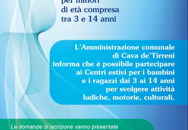 L’Amministrazione comunale di Cava de’Tirreni informa che è possibile partecipare ai Centri estivi per i bambini e i ragazzi dai 3 ai 14 anni per svolgere attività ludiche, motorie, culturali.
