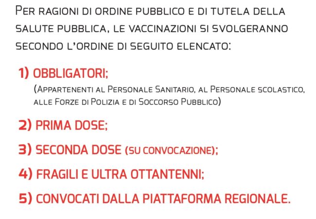 In pratica, precedono tutti quelle categorie che hanno l’obbligo di vaccinarsi, come i dipendenti delle forze dell’ordine, poi le prime dosi, quindi le seconde dosi ma su convocazione, poi fragili ed ottantenni, quindi quelli convocati dalla piattaforma regionale.