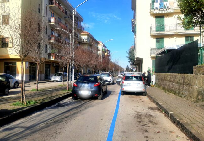 Viale Marconi è quasi tutto tinteggiato di blu. Ormai le strisce sono arrivate al confine con Corso Palatucci. Manca davvero poco per vederle arrivare all’area mercatale. Contemporaneamente sono state poste anche a via Tafuri, togliendo spazio, pare, anche a un posto di carico e scarico merci.