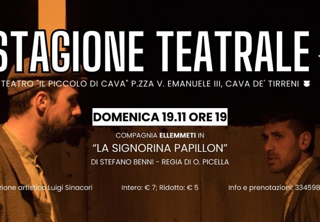 Dopo il successo del primo doppio appuntamento con la compagnia di casa ad inaugurare questa edizione, Cava de’ Tirreni ospiterà la compagnia ELLEMMETI (Libera Manifattura Teatrale) di Napoli. In scena La Signorina Papillon, commedia di Stefano Benni surreale e coinvolgente, con la regia di Orazio Picella ed interpretata, oltre dallo stesso Picella, da Jenny Brascio, Dino D’Alessandro e Simona Pisani.