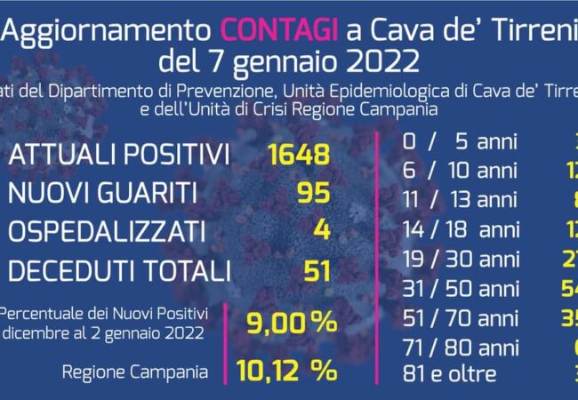 Gli ultimi dati sul contagio, aggiornati alla data di oggi, 7 gennaio, diffusi dal Dipartimento di Prevenzione Unità Epidemiologica di Cava de’ Tirreni e dell’Unità di Crisi della Regione Campania sono infatti più eloquenti.