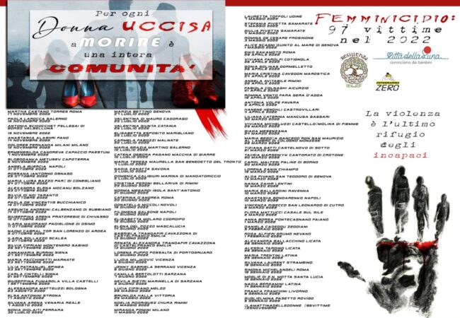 “La violenza sulle donne è un fenomeno fortemente radicato in Italia e continua a essere preoccupante: è ancora 1 donna su 3 a subire violenza, spesso davanti a figli e figlie. Per molte di loro, gli abusi sono diventati la normalità. Quest’anno sono già 92 le donne uccise. Per questo, anche quest’anno, rinnoviamo il nostro impegno la Cooperativa Sociale la Città della Luna e l’Associazione Resilienza Legale, con il supporto organizzativo di Filomena Avagliano Presidente Commissione Pari Opportunità installeranno delle scarpe rosse, a piazza Duomo nei giorni del 25/26/27 novembre. Rosse come il sangue versato dalle donne morte uccise. Rosso come la vergogna che tutti dovremmo provare”.