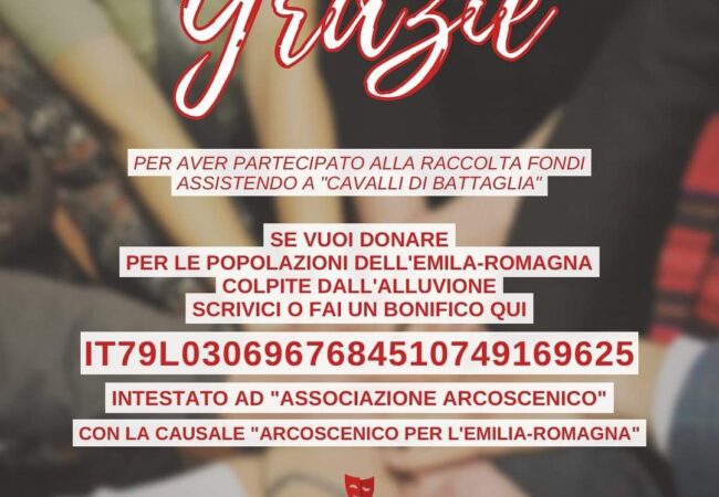 Dopo il grande successo dello scorso 10 giugno dello spettacolo “Cavalli di battaglia”, che si è svolto presso Teatro “Il Piccolo” dell’ex Seminario in Piazza Vittorio Emanuele III°, l’Associazione Culturale “Arcoscenico”, nel ringraziare quanti hanno presenziato all’evento, ha deciso di offrire la possibilità di continuare a contribuire, ancora per qualche giorno, alla raccolta benefica a favore delle popolazione alluvionate dell’Emilia-Romagna.