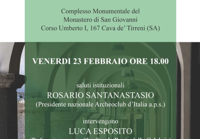 Venerdì 23 febbraio presso il Complesso Monumentale San Giovanni sito al Corso Umberto I°,167, si svolgerà la conferenza di presentazione della nuova sede cittadina “La Cava” dell’Associazione Archeoclub d’Italia.
